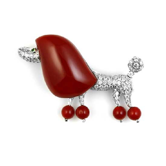 This 18K brooch features the look of a cute dog, which is regarded as a lucky animal in the Oriental. A dog coming into your home means fortune is to come. Also, a dog is taken as a human and loyal animal. The poodle-look of this brooch, conveying the meaning of loyalty, is highlighted with a large red coral main stone and accentuated with tiny red coral beads and delicate details. This succinct yet interesting brooch is a great complement to your outfits.