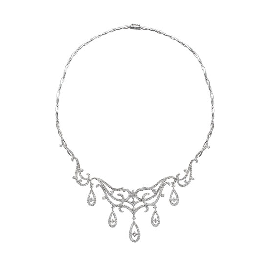 This is a chocker necklace carved from premium quality 18K gold. The curved patterns and clear diamond pave add a touch of femininity to the whole piece. It is a perfect jewelry piece for wedding ceremonies.