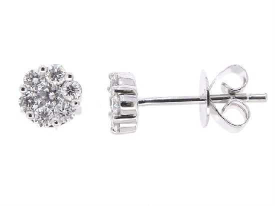 Pictured is a pair of earrings with 6 smaller diamonds surrounding a centered 0.08ct full cut diamond on each side. The design suggests modern elegance in a low-profile style. The earrings complete your evening look with an unspoken charm.