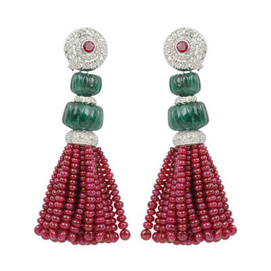 This pair of 18K gold earrings features a unique design. Each comes with two emerald melon beads and strands of ruby beads for an attractive look. The twinkling diamonds are also adopted to further complement the earrings.