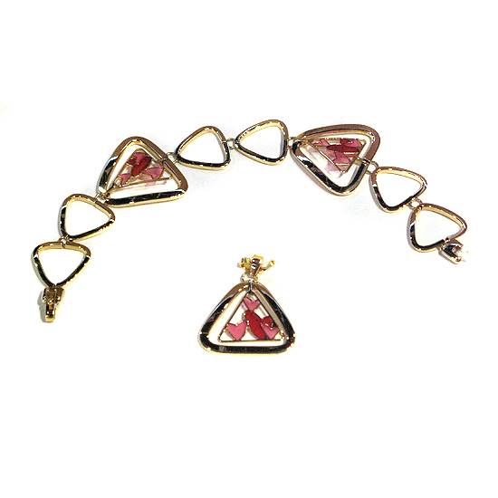 This is a set of 18k (750) yellow gold jewellery with enamel decoration. The set includes a bracelet and a pendant. Featuring triangles and openwork pieces with an enameled heart pattern, the set presents a young and stylish design which every ladies will be enchanted.
