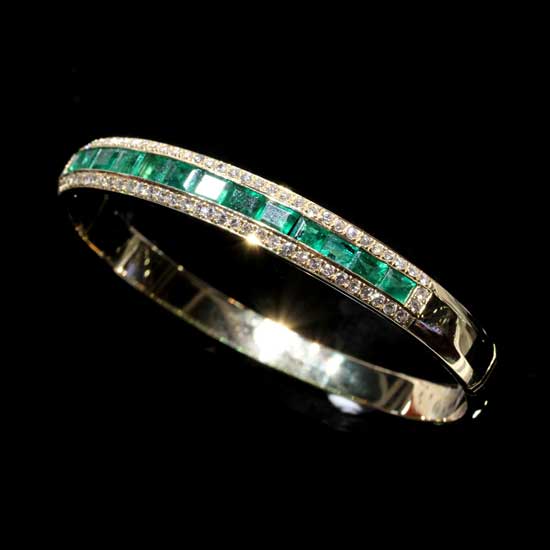 Showcased is a sophisticated bangle in 18K gold construction. The emerald accents give a mysterious touch. The diamond adornments offer added sparkles and elegance.