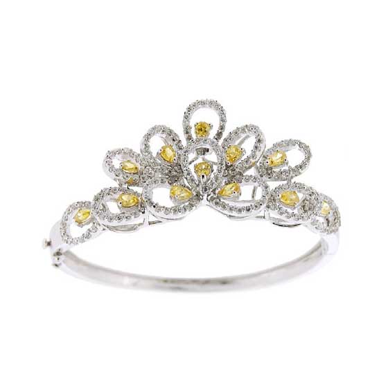 This is an 18K gold bangle with a chic and dainty appearance. It is accented with shimmering cubic zirconia stones and crystal stones for an elegant touch. This beautiful bangle complements your outfits nicely.