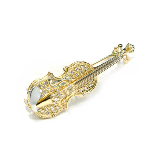 This is an 18K gold brooch that comes with a cute and attractive violin appearance. It is accented with allover shimmering diamonds for a luxurious touch. This fashionable brooch will add subtle elegance to your outfit.