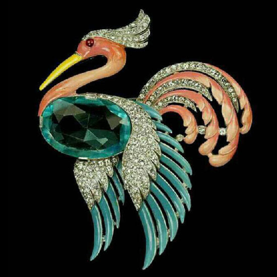 This is an 18K gold brooch that comes with a cute and lovely bird appearance. It is accented with a large blue gemstone as the centerpiece and small white diamonds. This colorful brooch will add a touch of glamor to your outfit.