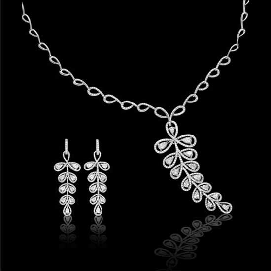 This diamond collection can definitely express lasting love with contemporary design. The showcased 18K gold pear-shaped diamond jewelry set includes a necklace and a pair of earrings. Both feature a leaf appearance with aristocratic grace and artistic flair.