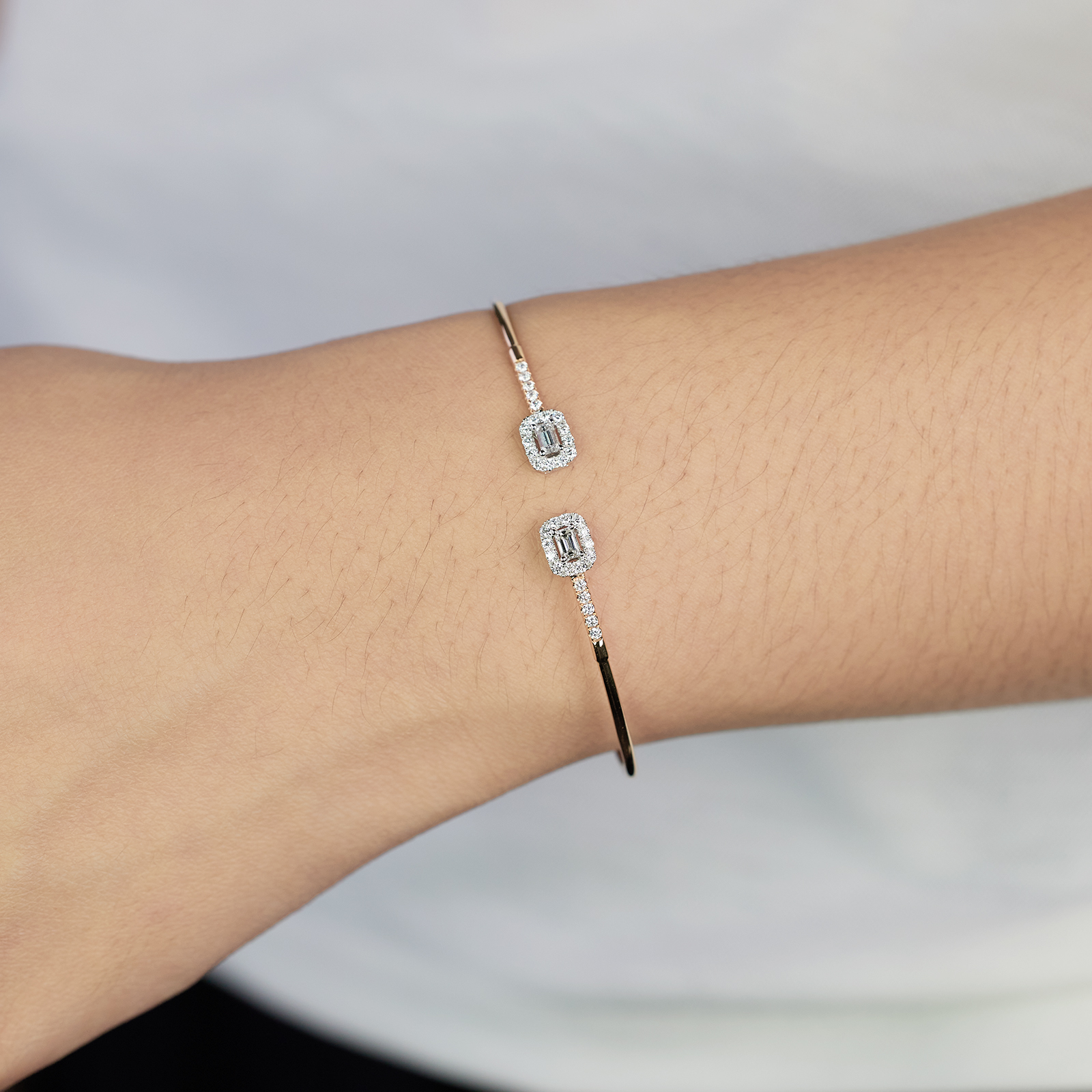 Mirage collection is using Round Cut and Baguette Diamonds to create a perfect Emerald diamond shape feeling to an illusion setting without unleashing the fire and sparkle of each stones.