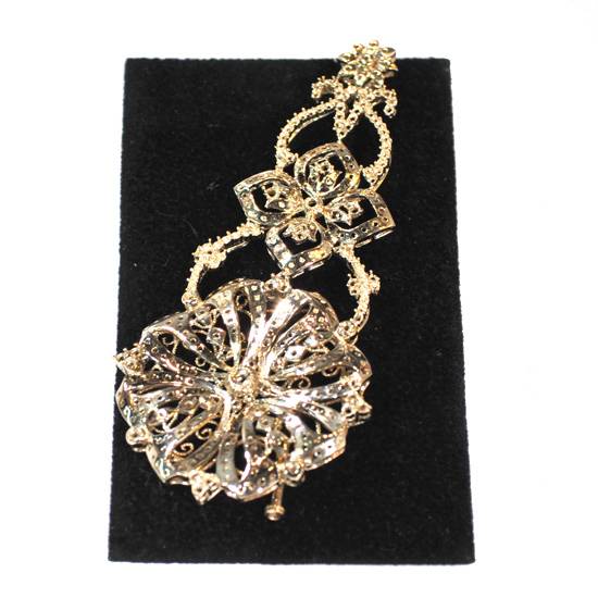 The featured jewellery is a 18K gold diamond pendant, which can also be used as a brooch. The botanical openwork feature with scrolls is set with small round diamonds in bead setting, producing a sparkling and glamorous appearance to the fine jewellery piece.