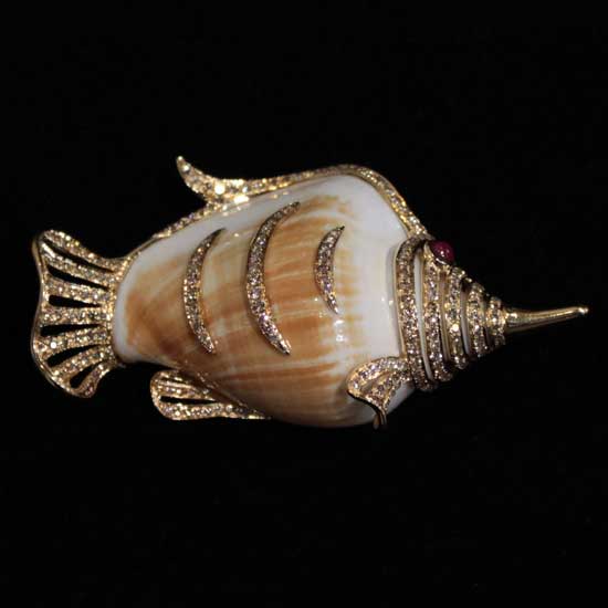 The stunning ladies' pendant touts a well-executed design of a fish. The body of the fish is meticulously crafted by first-rate 18K gold and a natural shell, bringing out a touch of elegance with an extraordinary appearance. Striving for elegance, the fish-shaped pendant is finely set with twinkling diamonds and a lustrous ruby. Show your love to your special one with this 18K gold diamond pendant.
