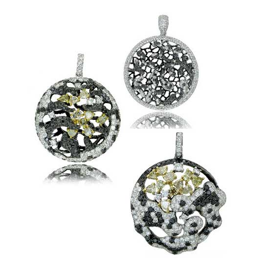 This 18K gold comes in a round shape with delicate cut-out details and floral motifs. It is lavishly adorned with black, yellow and white diamonds for aristocratic glitz. This ravishing fancy diamond pendant is sure to glam up your neck.