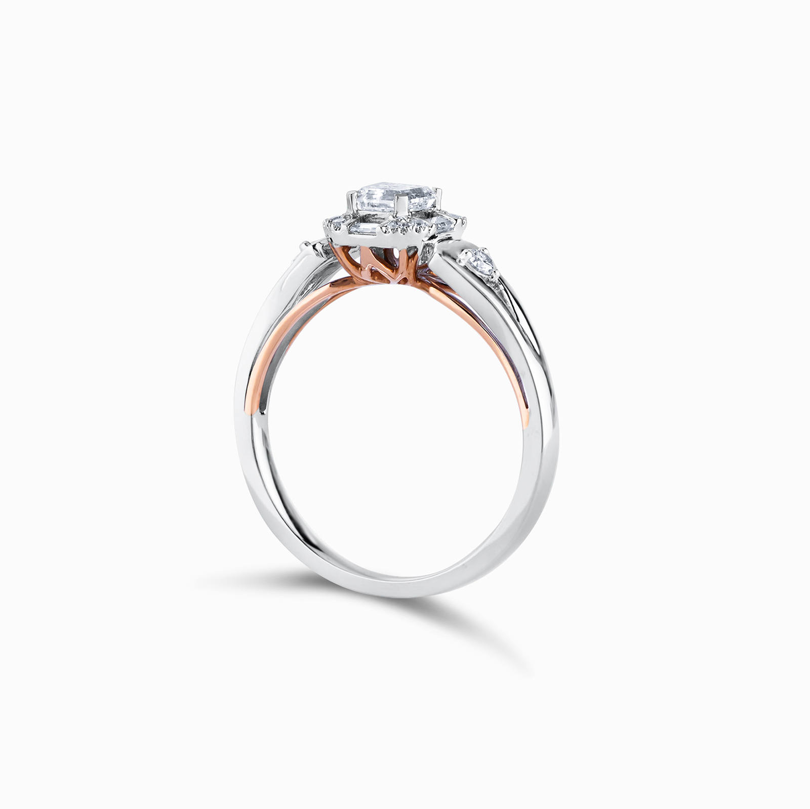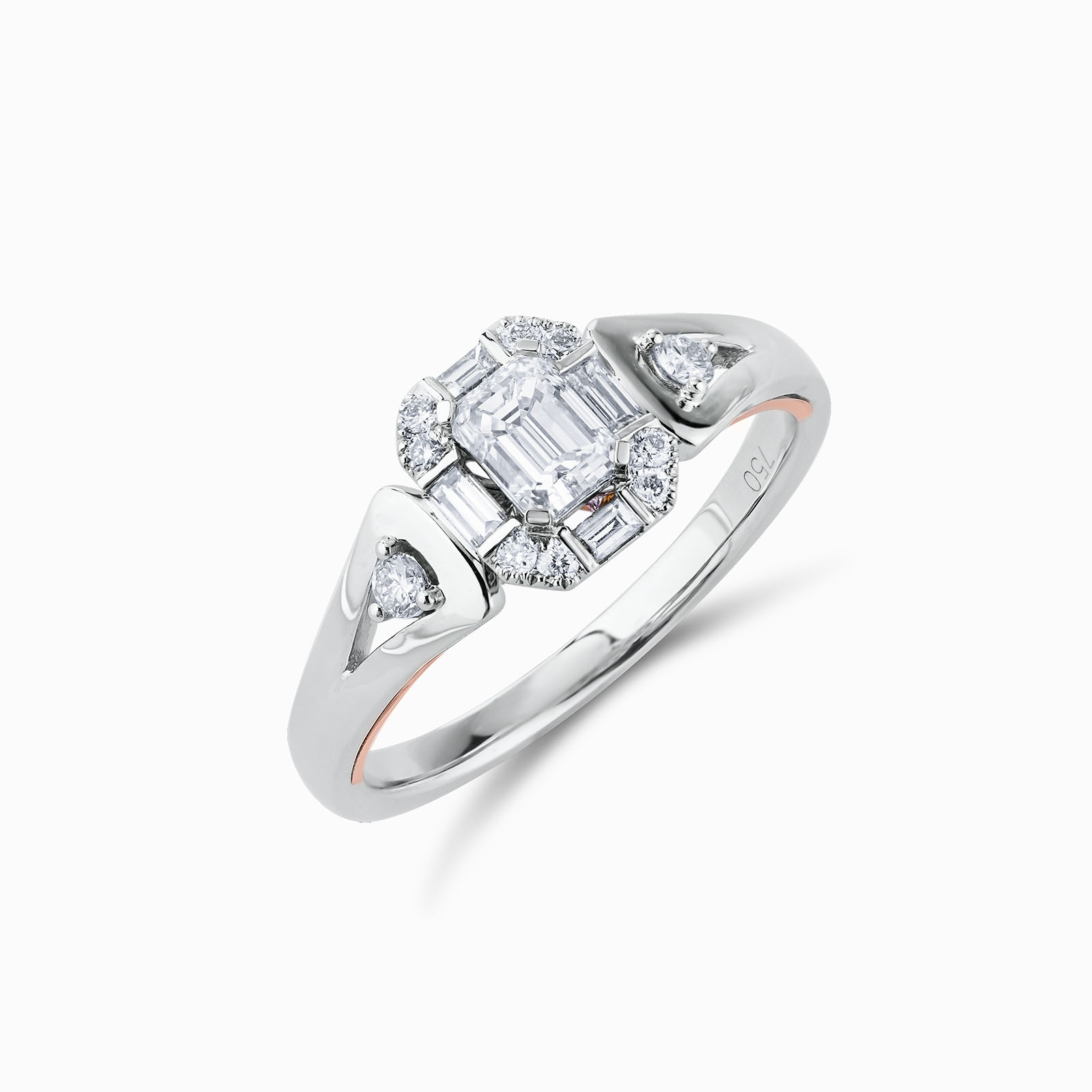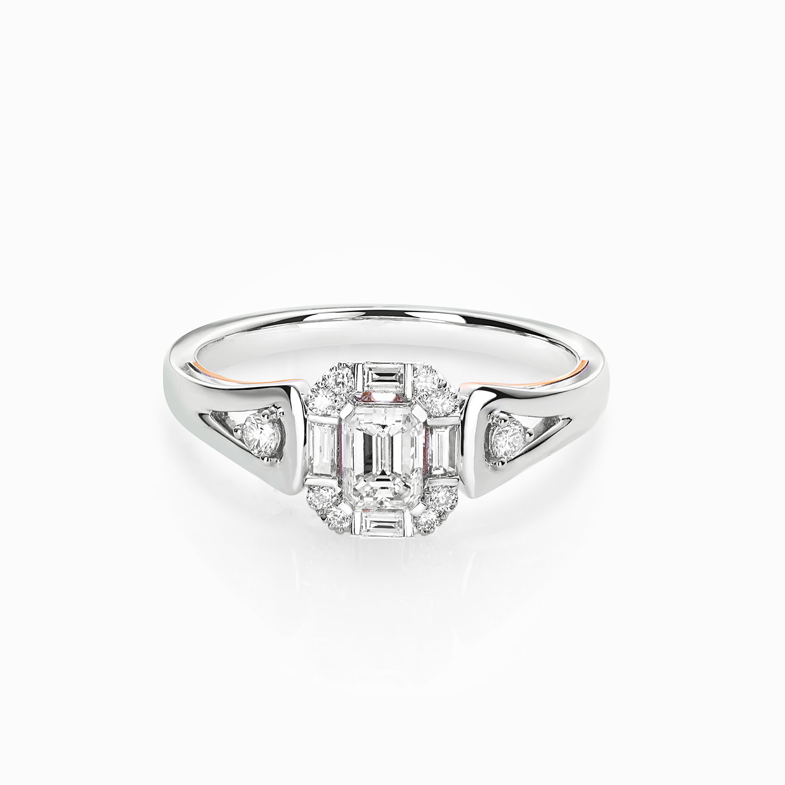 Mirage collection is using Round Cut and Baguette Diamonds to create a perfect Emerald diamond shape feeling to an illusion setting without unleashing the fire and sparkle of each stones.