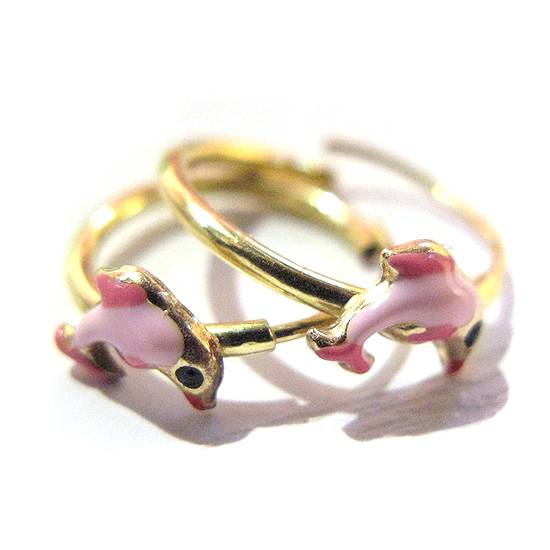 This is a pair of earrings with a dolphin design in enamel. It comes with 18K yellow gold rings which does not cause allergies to the wearer. The cute dolphin is pink in colour, and different kinds of animals are available upon request.