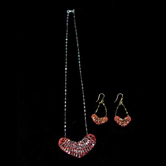 Displayed is an ornate set of jewelry including a necklace and a pair of earrings. This beautiful jewelry set is finely crafted of 18k gold. It makes an excellent gift idea for sophisticated ladies.