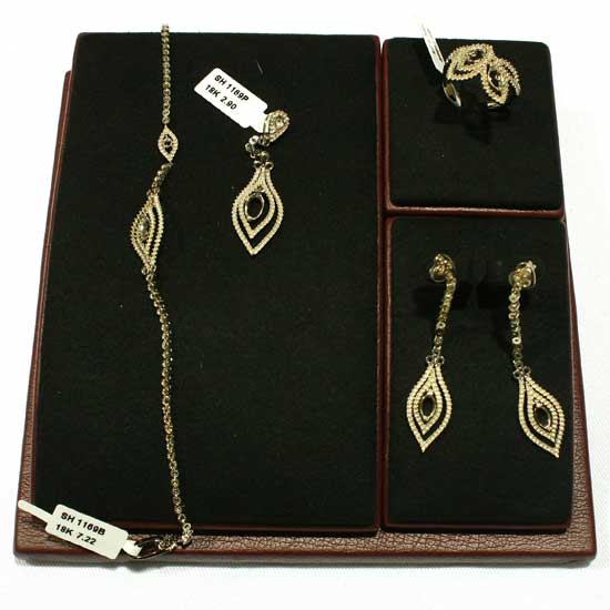 Featured here is a jewelry set that is well designed in 18K gold setting. This jewelry set consists of a ring, a bracelet, a pendant and a pair of earrings. This 18K gold jewelry set is surely an ideal addition to your jewelry collection.