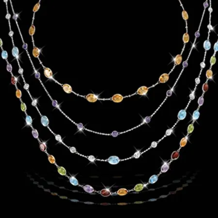 These are 18K gold necklaces with semi-precious stones. The necklaces in various styles mainly feature a 18K yellow or white gold chain with semi-precious stones round or oval in shapes of different sizes. They are adjustable in length.