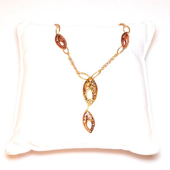 The featured jewellery is a 18k yellow gold drop necklace for ladies and women. The gold chain is decorated with several leaf-shaped ornaments with delicate filigree patterns, giving the necklace a noble and aristocratic style.