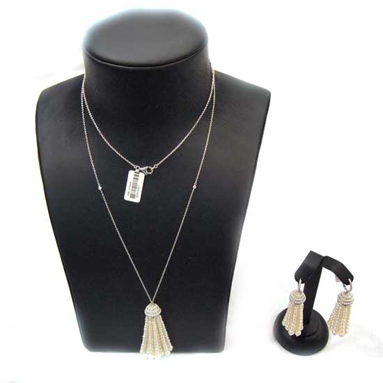 This is a dainty necklace in an 18K gold setting. It flaunts tassel pearls accented with brilliant diamonds. This diamond necklace matches evening dresses nicely.