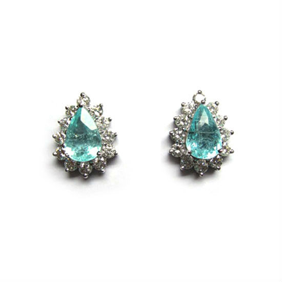 This pair of 18K gold Paraiba earrings comes with a fashionable design. Glittering with immense glamorous touches, the earrings are finely crafted as rain-drop shapes and framed by sparkling stones. The charming earrings are ideal for glitzing up your look.