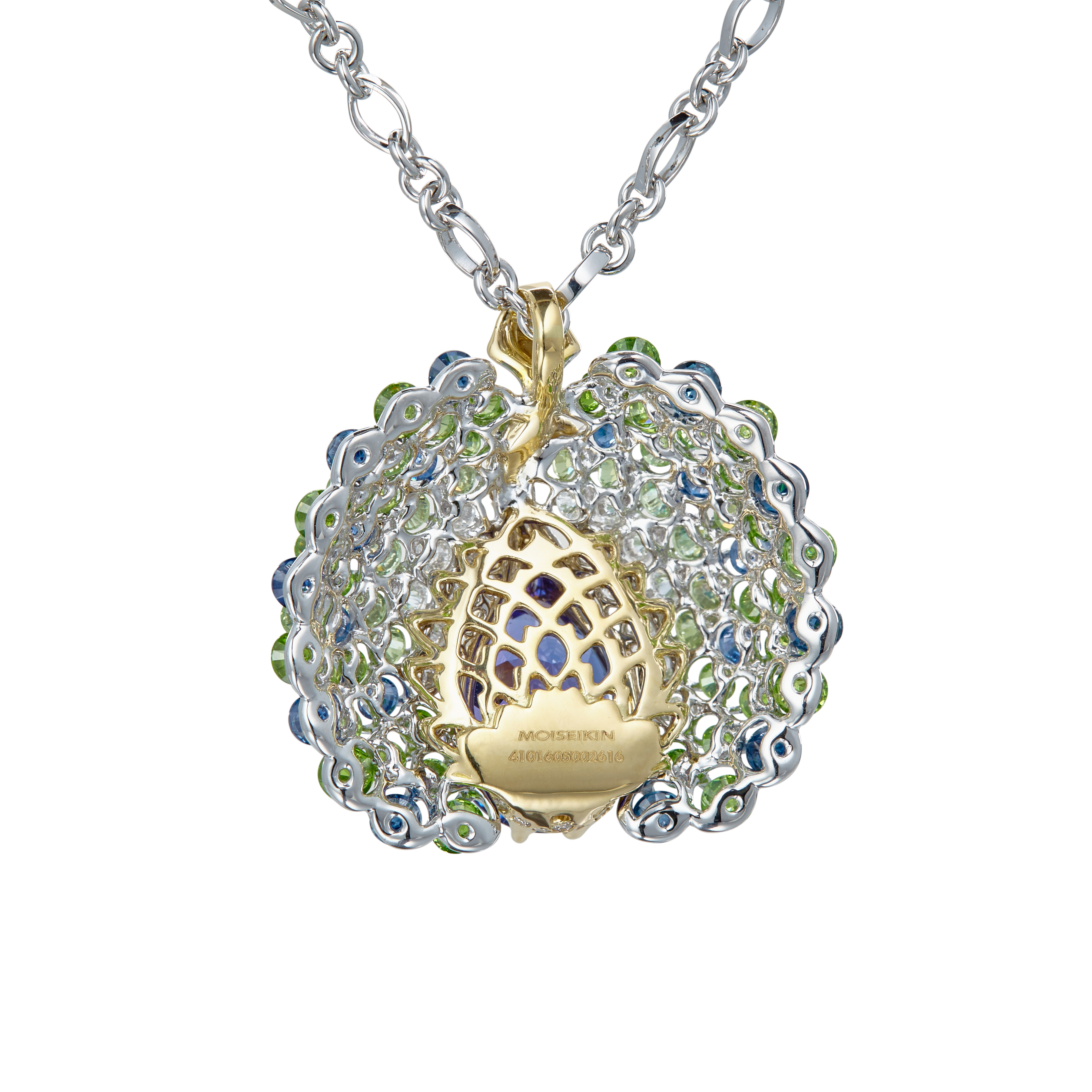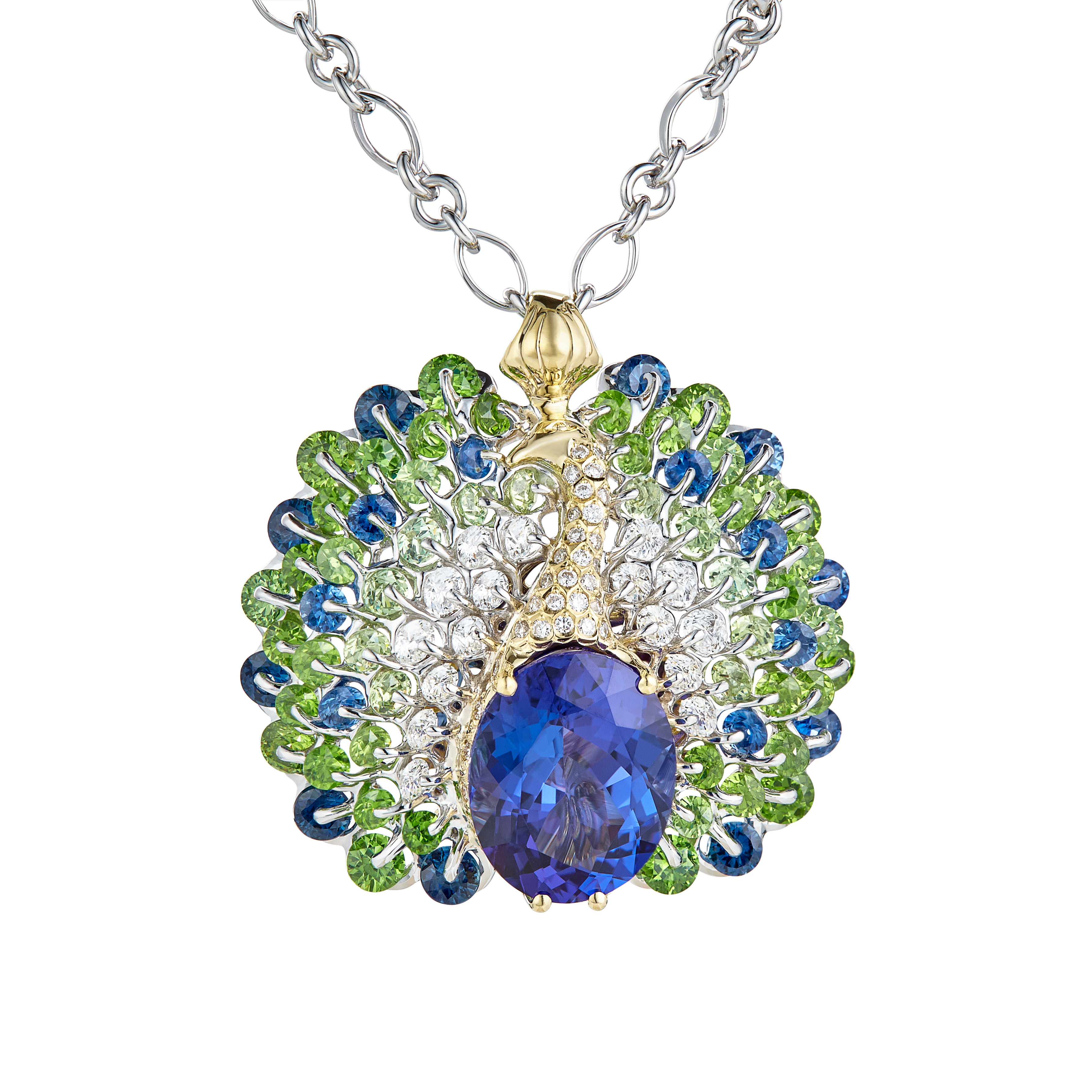 A vivid and clean 4ct Tanzanite is mounted in the innovative setting inspired by a graceful peacock. Waltzing Brilliance technology is an innovative jewelry invention patented by Viktor Moiseikin, in which a diamond facet gem secured by two points rotates and trembles while maximizing the shining effect. It enables the gem to turn and tumble freely, releasing the maximum light. The perfect combination of blue sapphire and Russian demantoid garnet matches the central Tanzanite, while this unique setting gives an airy and feathery impression. A matching Ring is available.