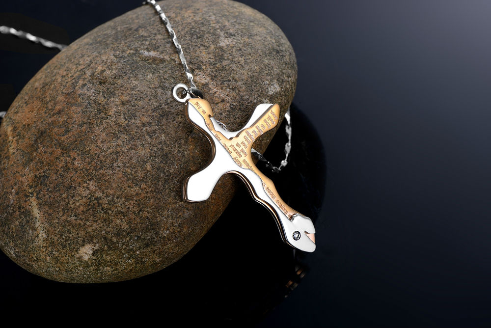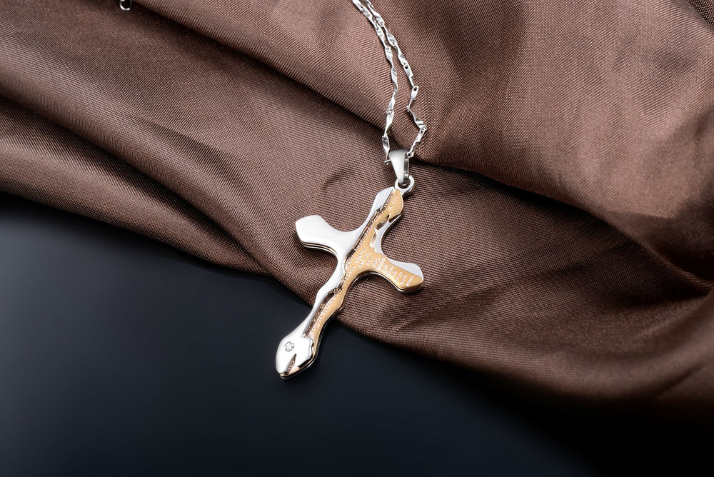 This is a sleek and spiritual cross pendant that is truly a wardrobe staple. The cross pendant has curvy edges all along, and a half of it features imprinted biblical passage from the Lord’s prayer. Fashioned from stainless steel and with 18K gold plating, this accessary gives a refined, burnished look for sure.