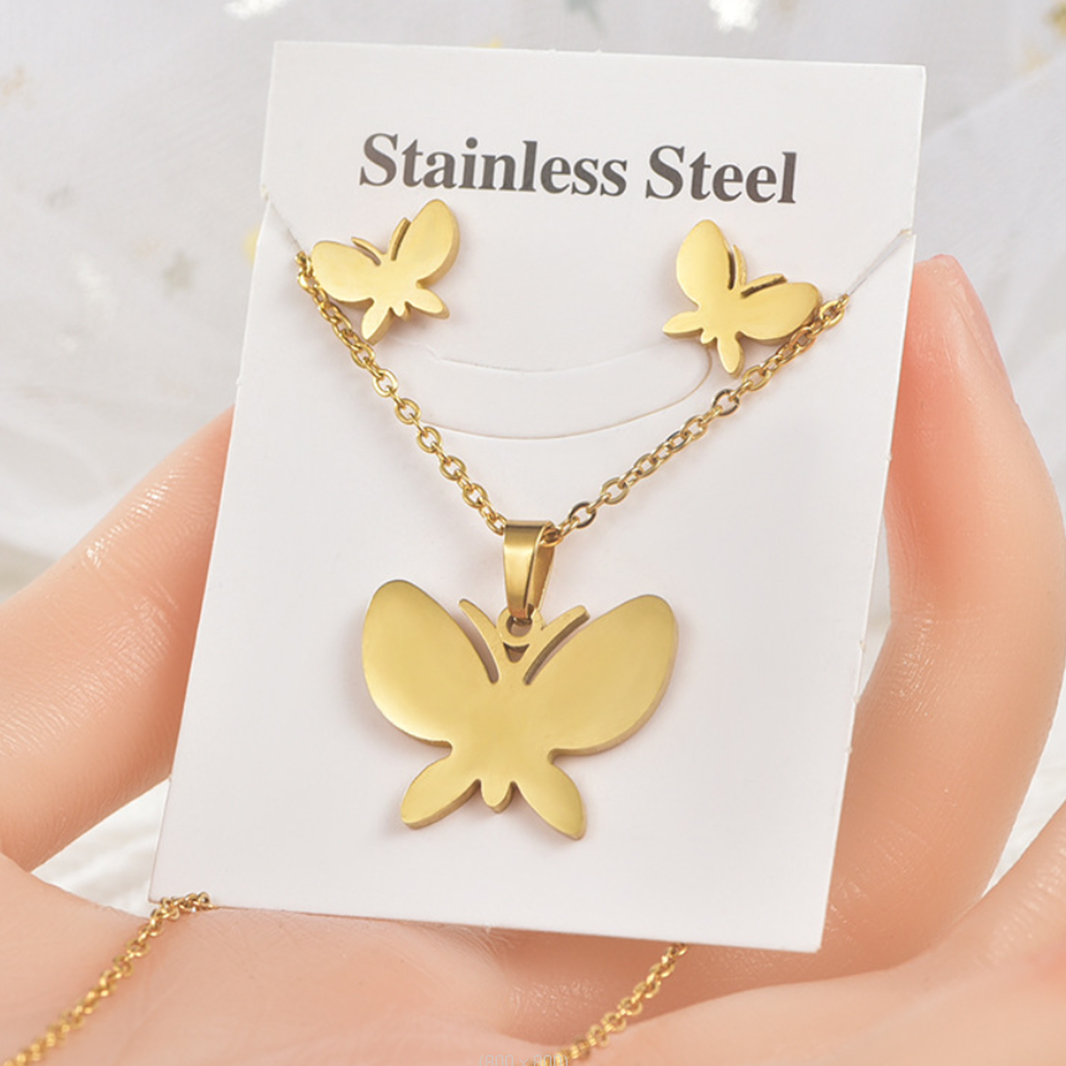 18K Gold Plated Stainless Steel Butterfly Shape Necklace Earrings Set