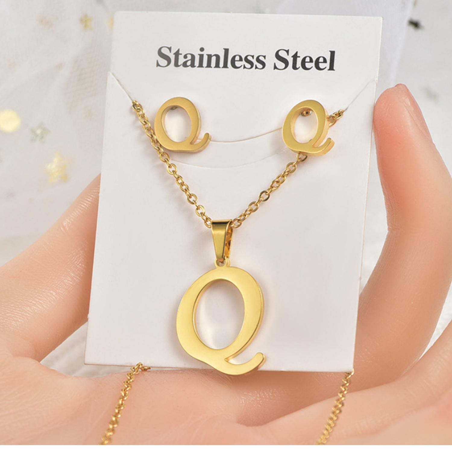 18K Gold Plated Stainless Steel Letter Q Shape Necklace Earrings Set
