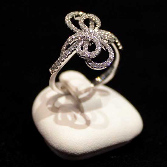 The spectacular 18K gold ring features a clustering design, with two interlocking ribbons embedded with sparkling diamonds. Half of the band is also embellished with tiny diamonds, making the jewelry item exceptionally overwhelming. The glamorous design accentuates ladies' evening dresses.