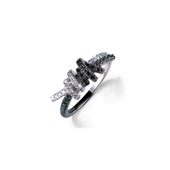 This ravishing 18K gold ring features two branches intertwined with each other, appearing like a love tree. The use of quality black and white diamonds on the branches matches respective black and white 18K gold, adding an extra dimension to the artistic touch.