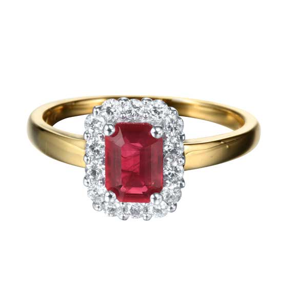 This pictured ring is crafted with 18K gold, diamonds and a red gemstone. The ring is carefully designed and polished for added luster. This classy piece draws attention to your hand.
