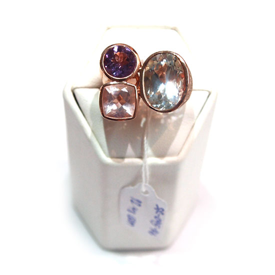 Pictured here is a fashionable ladies' ring crafted in 18K gold. The semi-precious stones in different sizes and colors shine with alluring glow. This gorgeous gold ring is sure to take your breath away with its one-of-a-kind design.