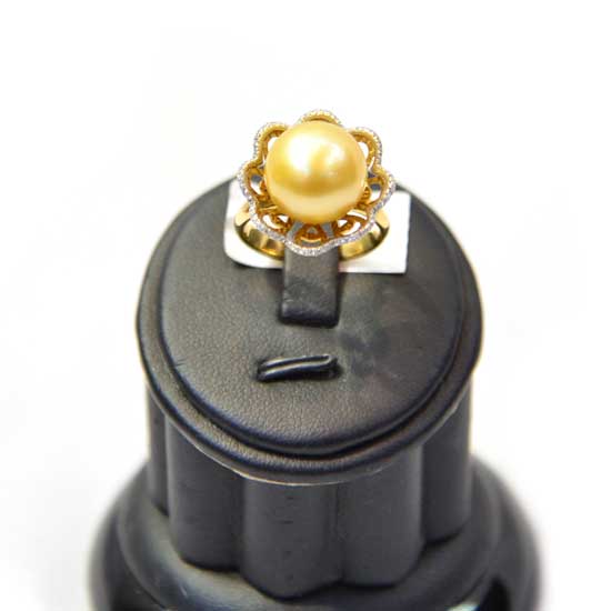 This finger ring features a large round golden-toned south sea pearl as the centerpiece. The allover small diamonds are well paved on the 18K gold floral setting. This stylish ring makes an ideal addition to complete your jewelry box.