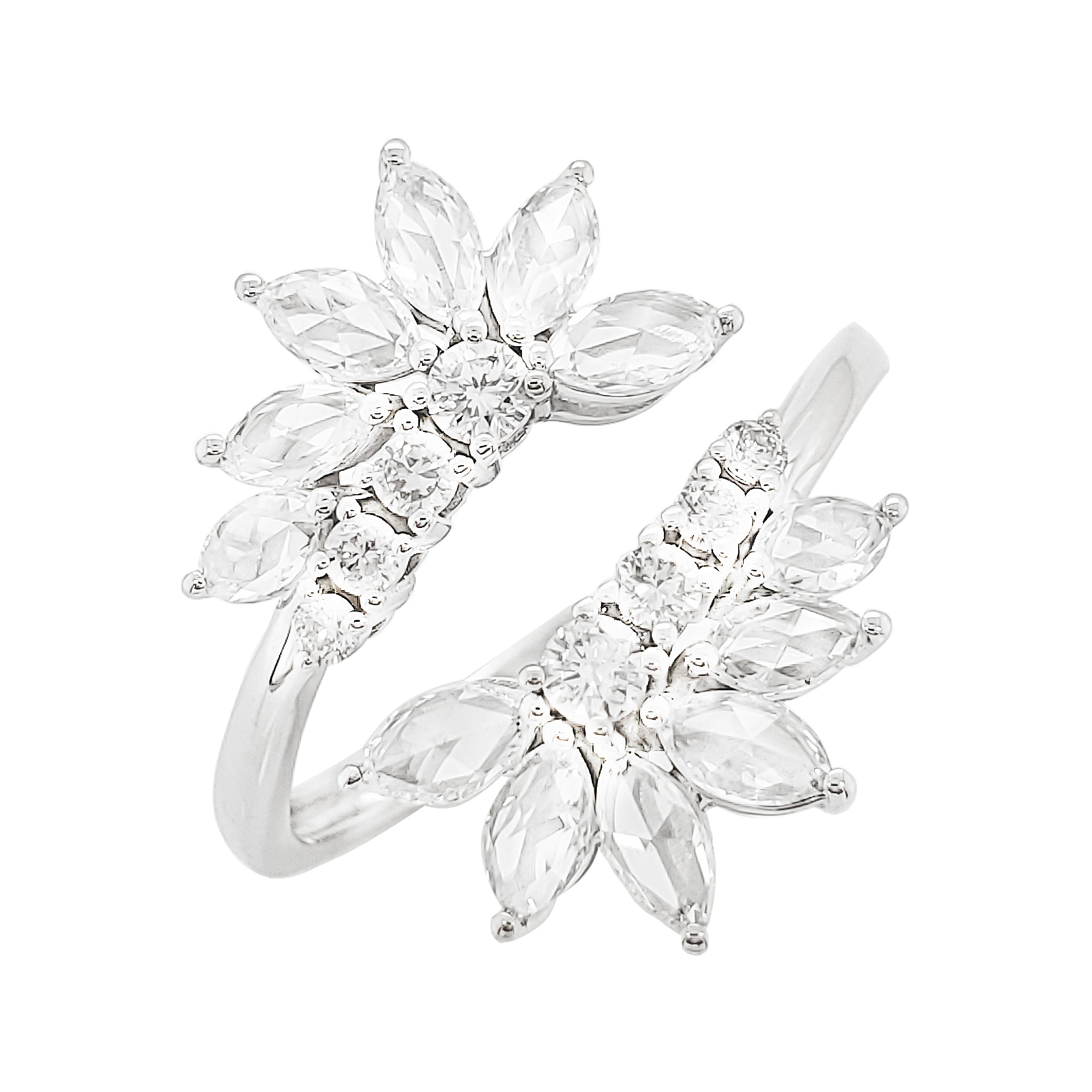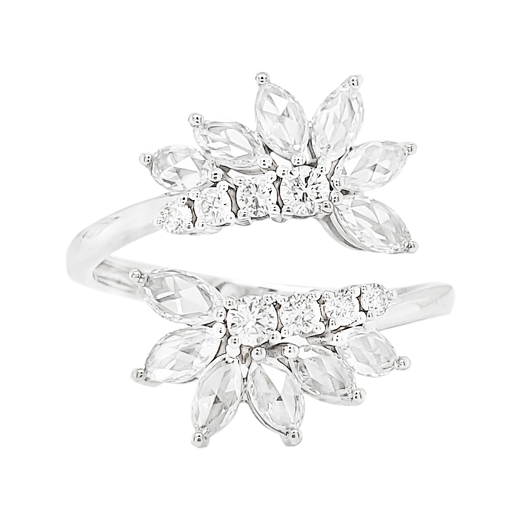 18k gold ring natural diamonds rose cut floral by-pass ring.