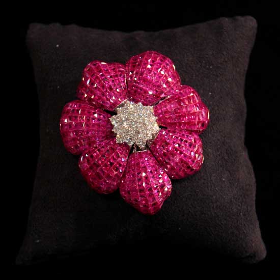 This pendant is made of 18K gold with ruby decorations. It comes in the shape of a flower to add a decorative touch. The vibrant red pendant is an alluring piece to complement your evening dresses.