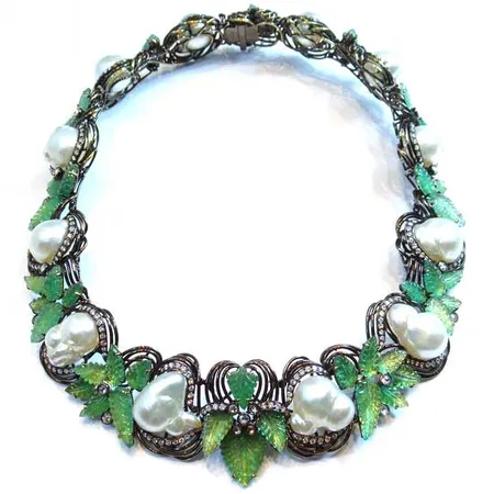 The displayed necklace features South Sea Baroque pearls as the prima donna. The necklace is made with 18K black gold for a touch of exquisiteness. The emerald leaves and paving diamonds help to make the necklace a unique piece.