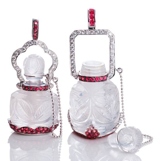 This is an extraordinary piece of luxurious gift. The elegant and gorgeous glass perfume bottle is decorated with diamonds, rubies and rose quartz in a 18K white gold frame. The exquisite jewellery bottle in the theme of blossom and romance is a definite for the high society members.