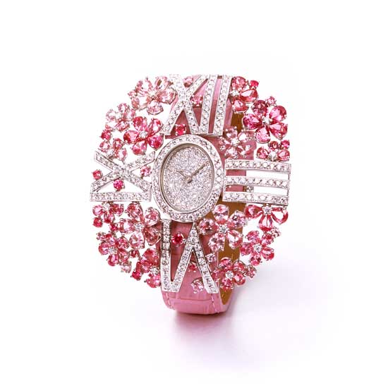Displayed is a jewelry watch that comes with an extravagant design. The round dial is surrounded with an extension surface with decorative flowers and roman numerals. This stylish jewelry watch is a great choice for fashion timepiece.