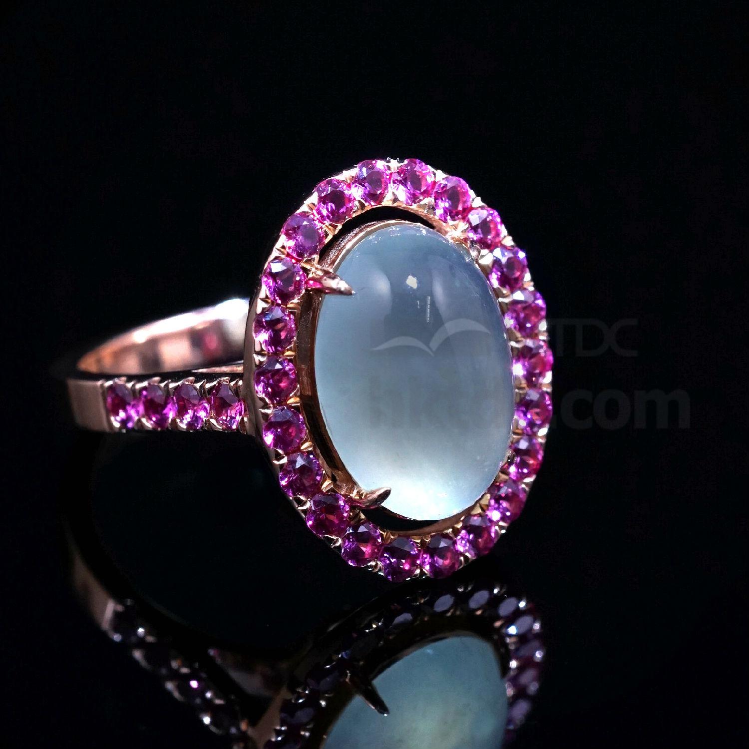 This jadeite finger ring has a modern vibe. It is set with icy jadeite cabochon and pink sapphires for a spectacular appearance. This ornate ring offers your everyday wear with an irresistible grace.