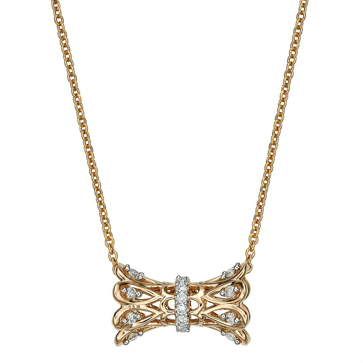 Glittering and stylish, this bow-inspired necklace pleases every lady for sure. The pendant part highlights a neat openwork design, whose sides feature scalloped edges to lend a lovely vibe. Twelve diamonds are sparsely inlaid on it and 18K gold chain is employed for a lavish finish.