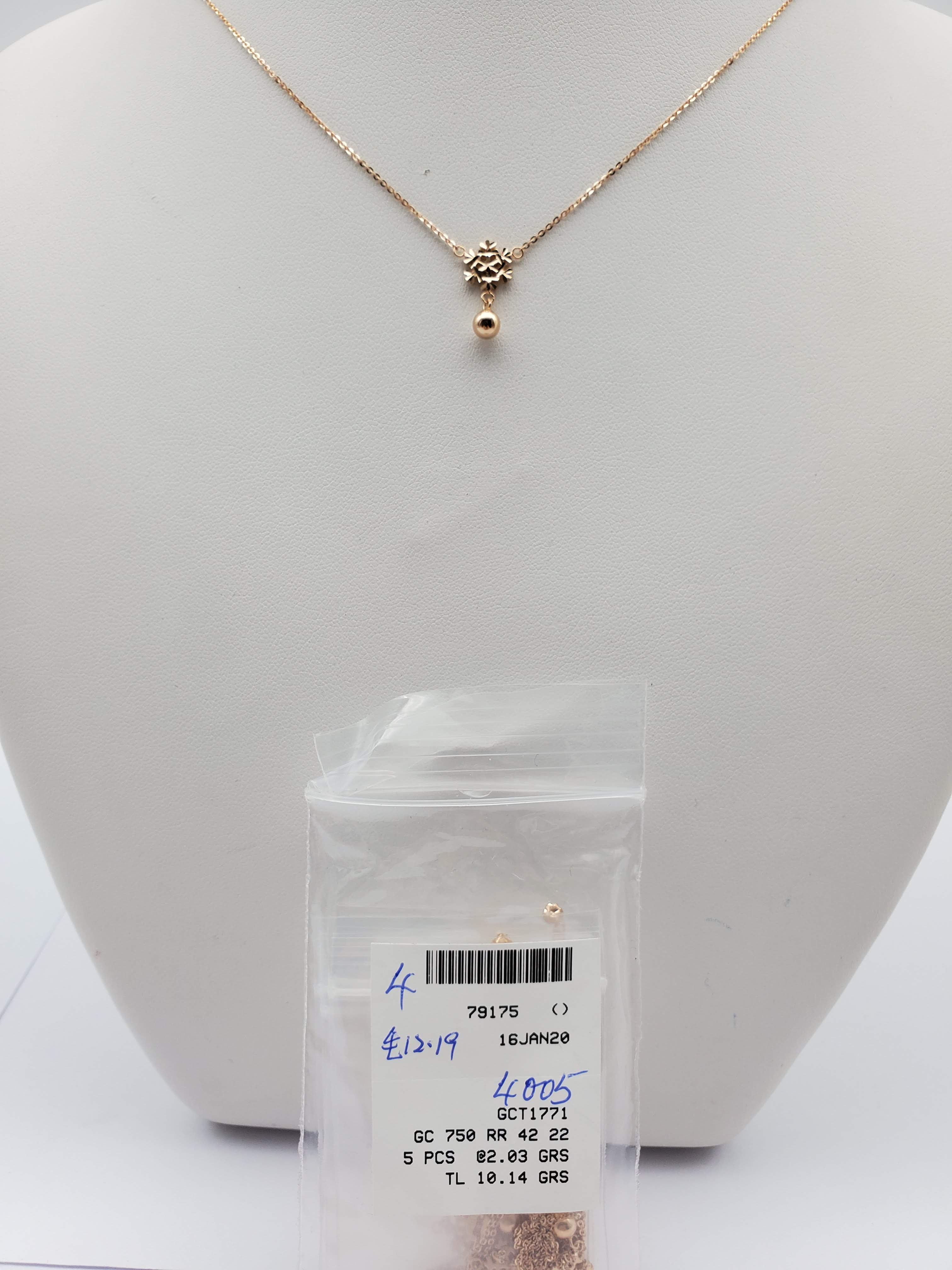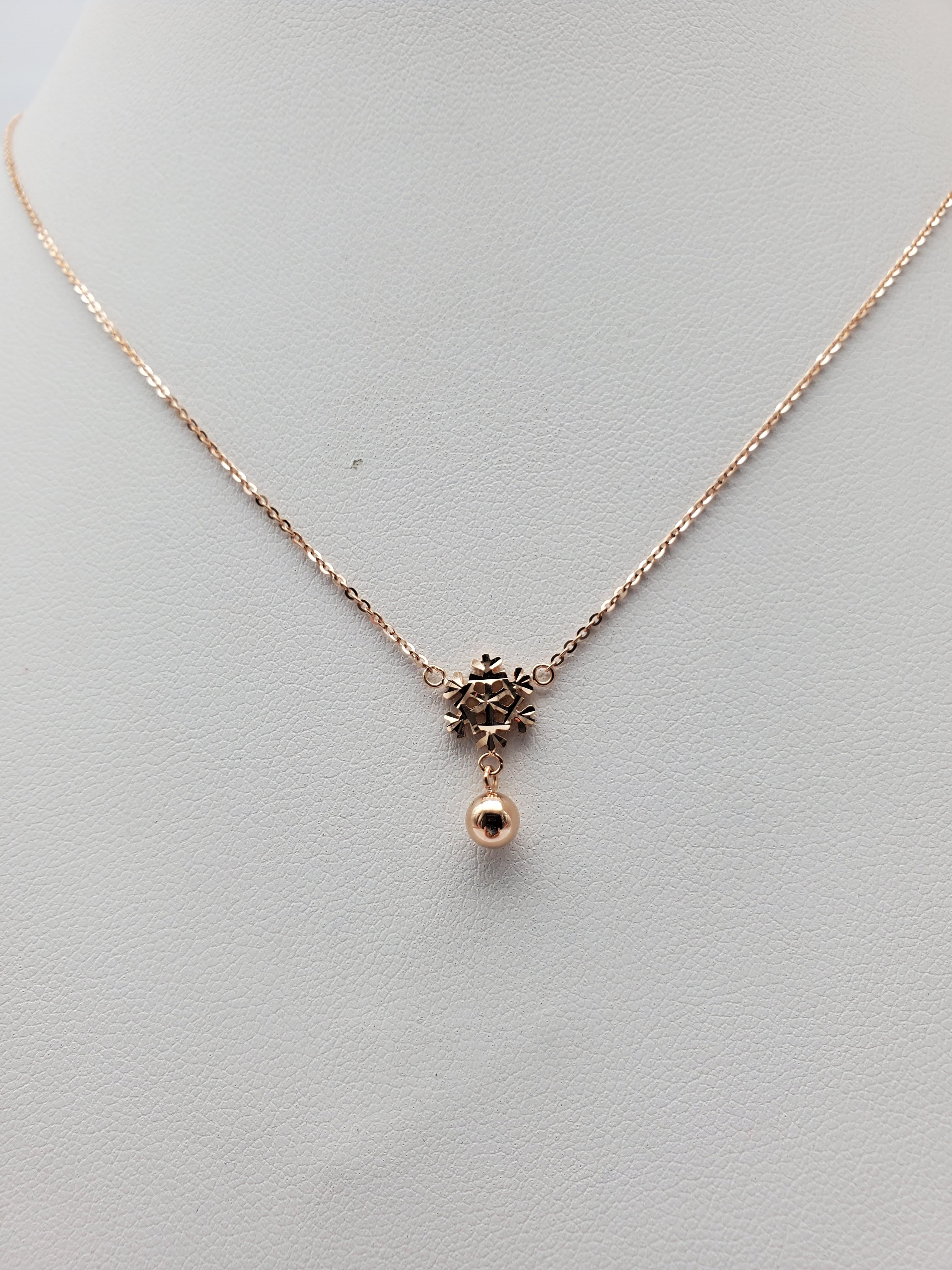 A piece of pink gold necklace hanging in the middle part with snowflakes design followed with a shiny ball.