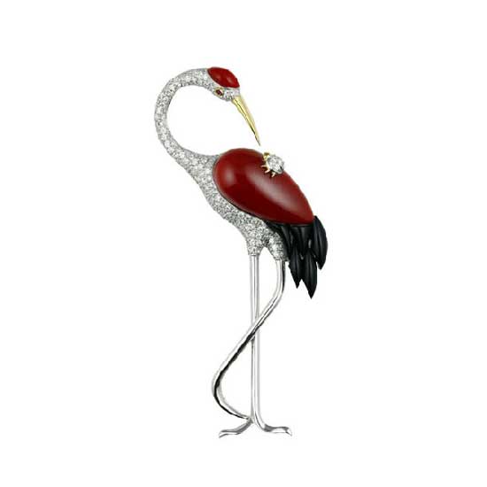 This 18K red coral brooch features the look of a red crowned crane with a tiny ladybug resting on its back. Detecting the ladybug, the red crowned crane elegantly plays with the little friend with its long beak to show its welcome. This touching brooch is meaningful and full of emotion.