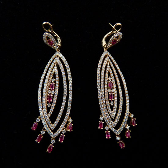 These drop earrings shine with a combination of red and silvery glimmers. The rose gold frames are fully embellished with white diamonds and accented by dangling rubies. You can look exceptionally glamorous with these amazing pieces.