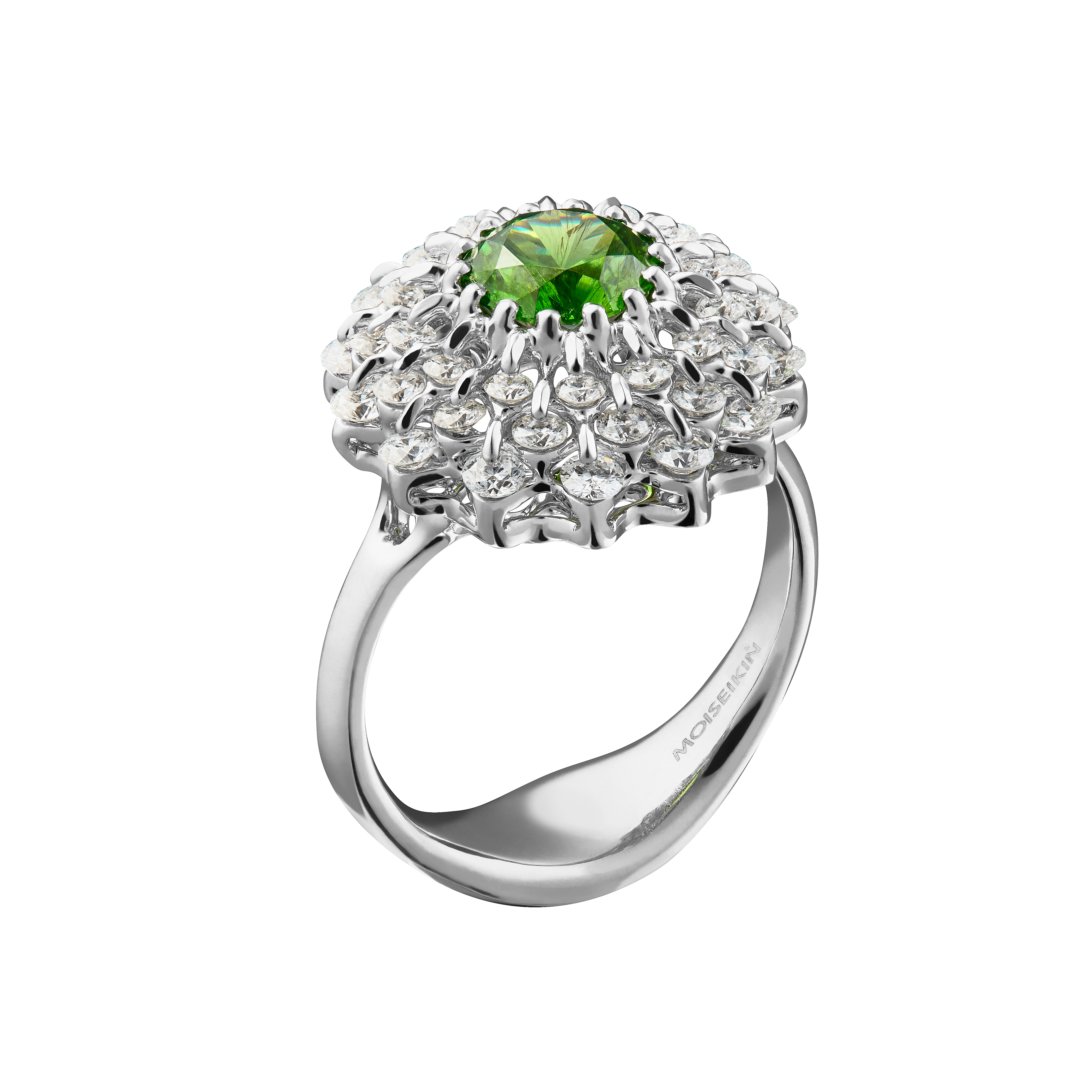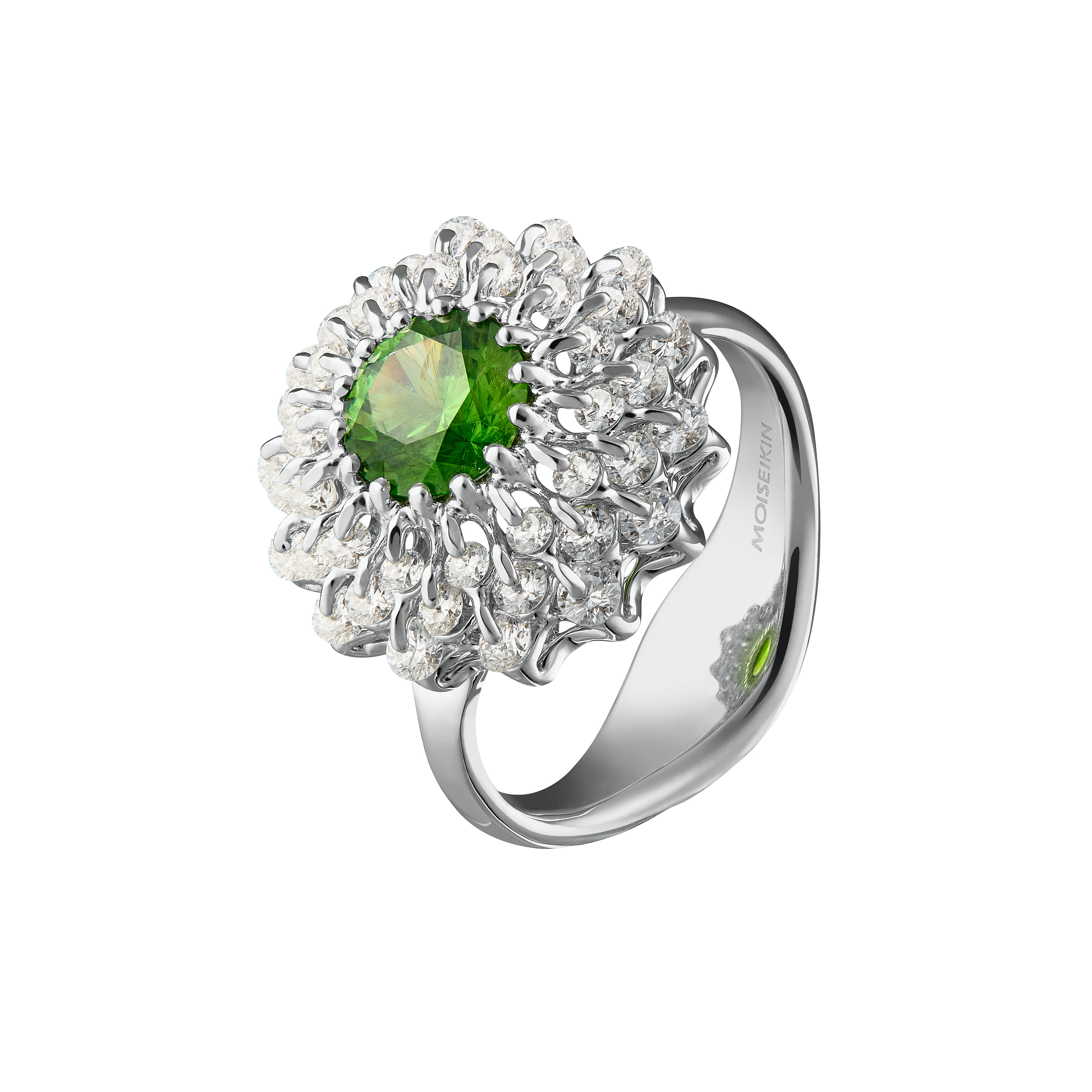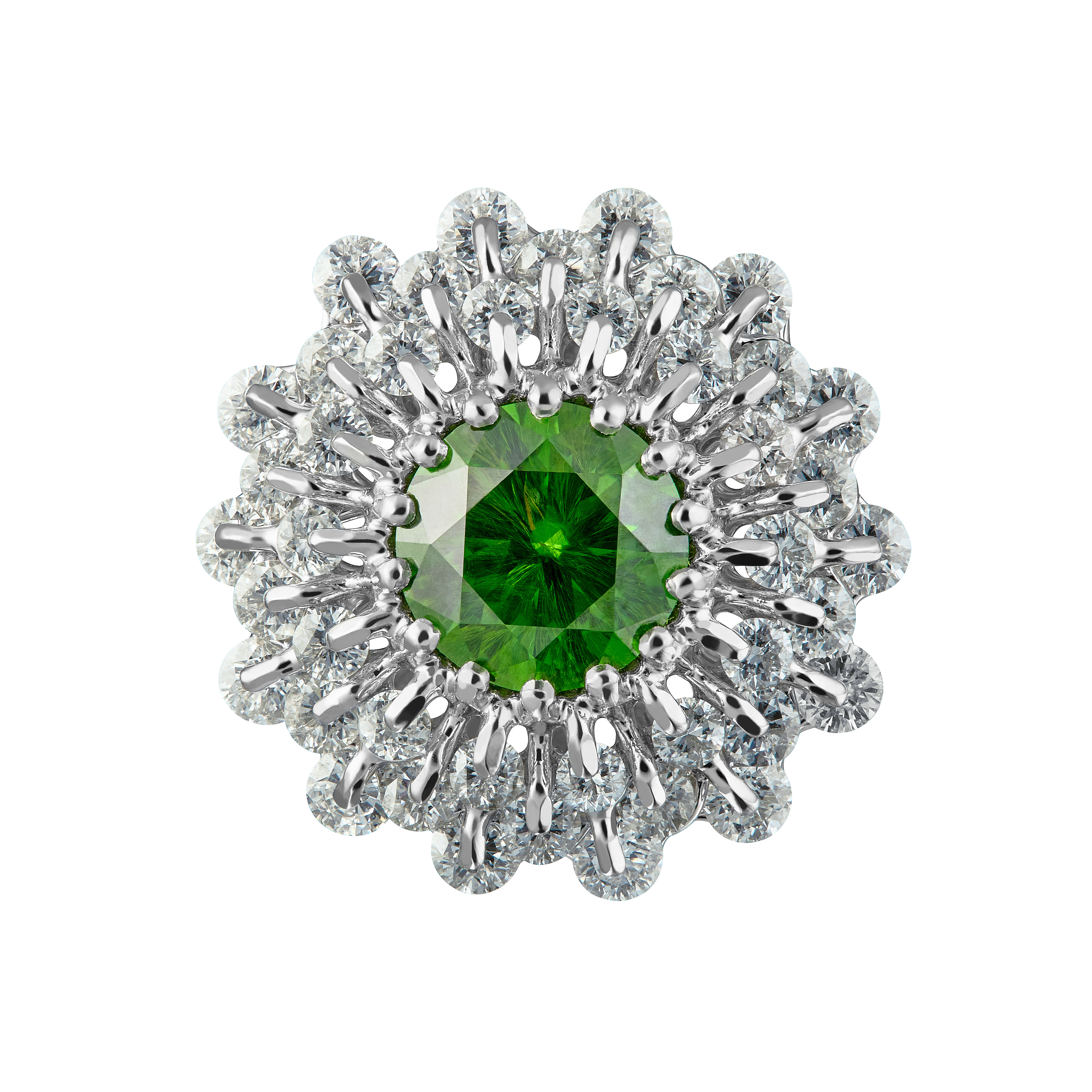 1.38ct rare natural Russian demantoid garnet from the Ural is mounted in the innovative frame design, patented in the US, China and Europe. In the modern Russian Setting "Waltzing Brilliance®," a gemstone trembles and rotates, creating the unusual shine effect while enhancing the beauty of the central stone.