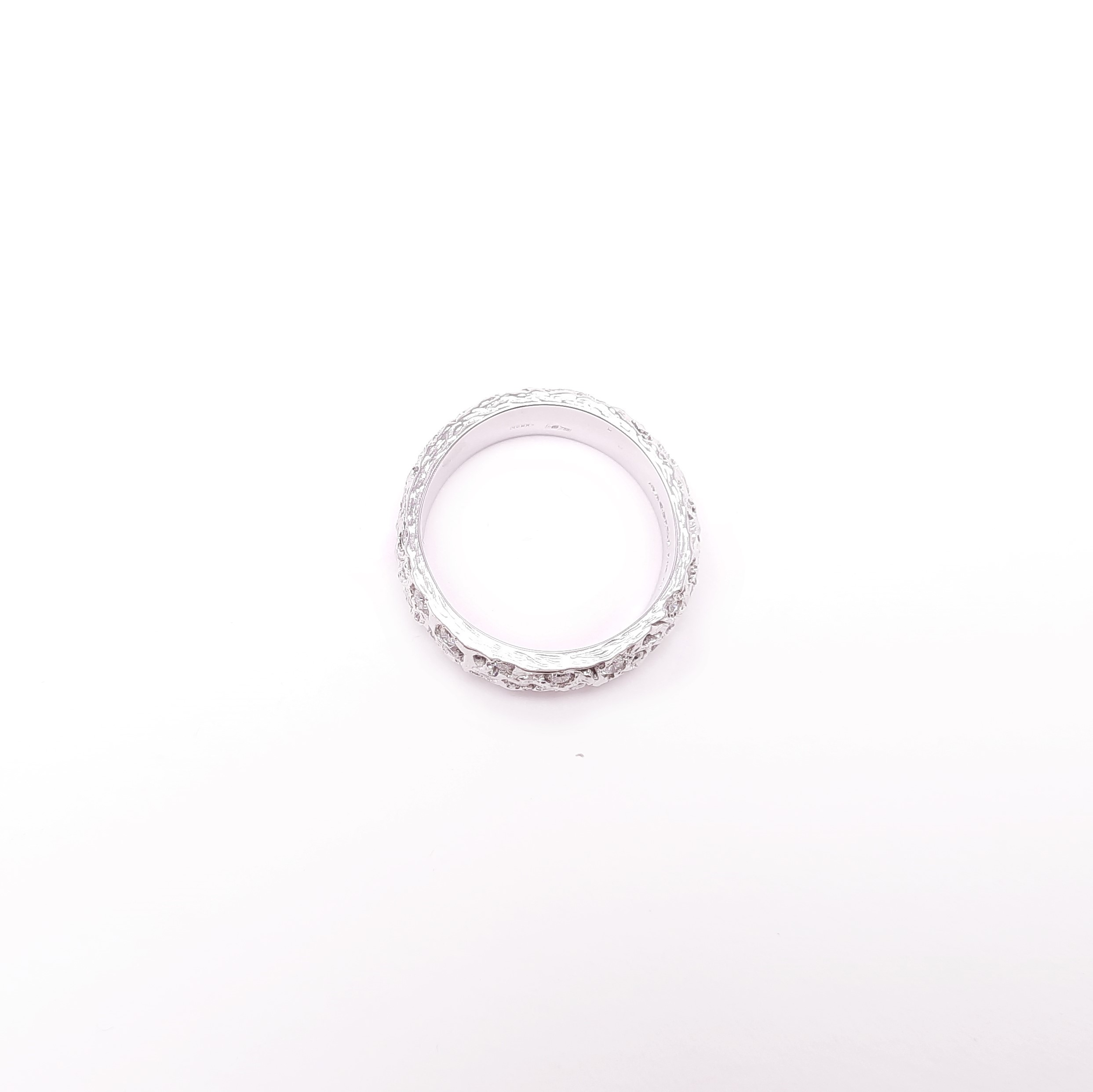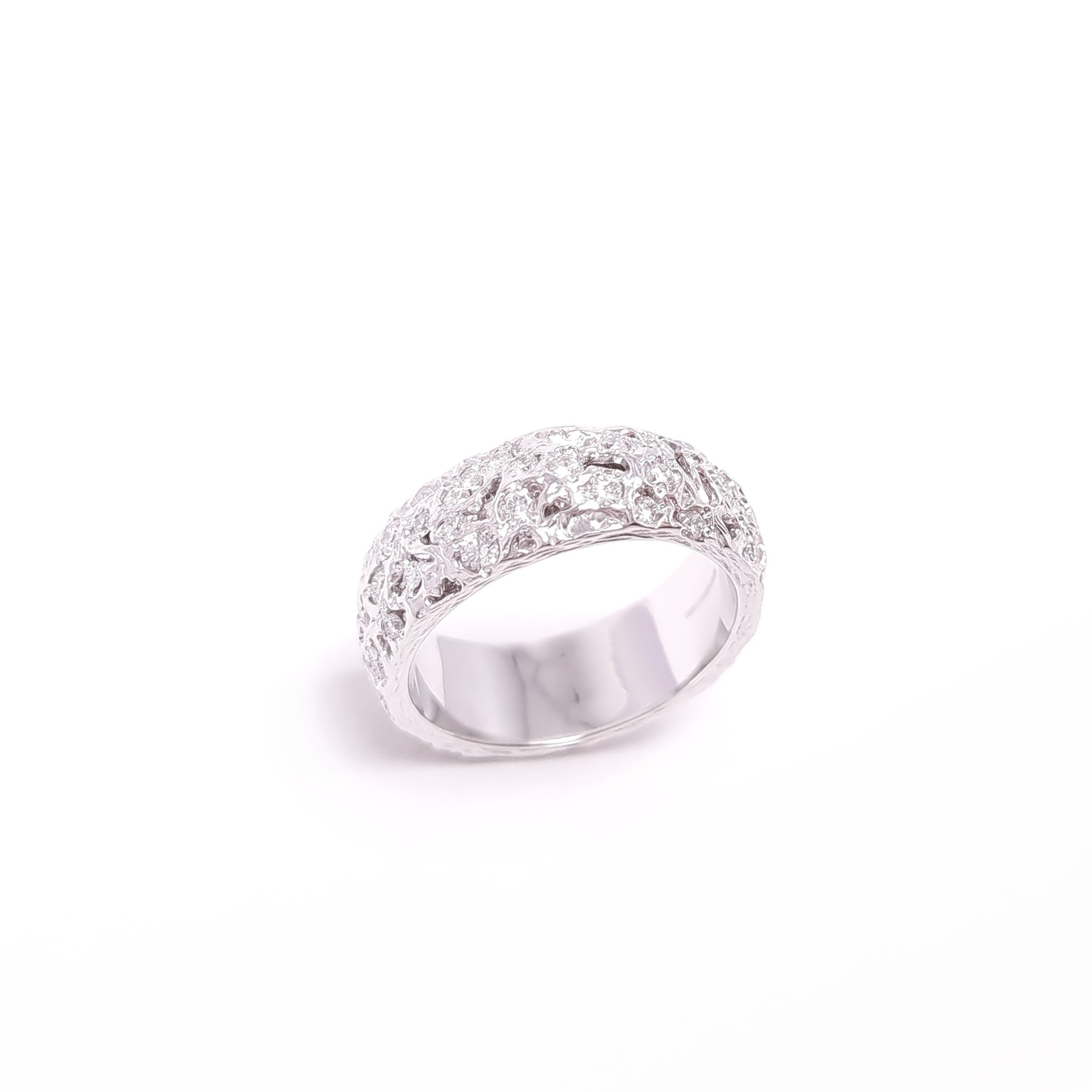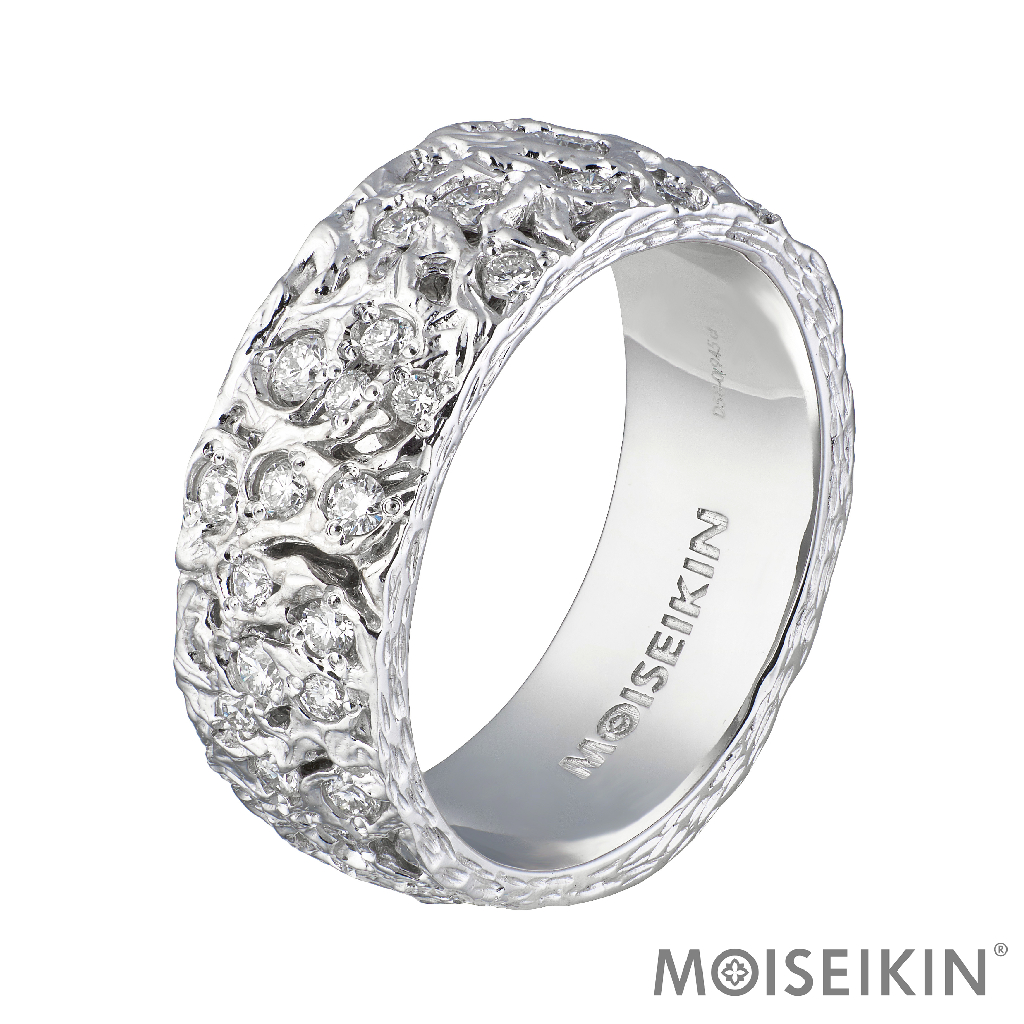 Newly developed from MOISEIKIN®, a ring with shiny swirling clouds holding diamond stars is inspiring. Inspired by the Impressionism of Vincent Van Gogh masterpieces, the ring is artistic and individual, thanks to the combination of our traditional carving skill and innovative technology. The ring gives unusual shine not found on other diamond jewellery, consisting of 2 layers of the polished surface underneath and the engraved surface on the top. This elegant and aesthetic ring can be used as a marriage or anniversary ring, not only for fashion purpose since the ring is fully decorated with diamonds and engraving. Since the ring is not resizable, please do not hesitate to inquire your sellable size. The matching earrings are available.