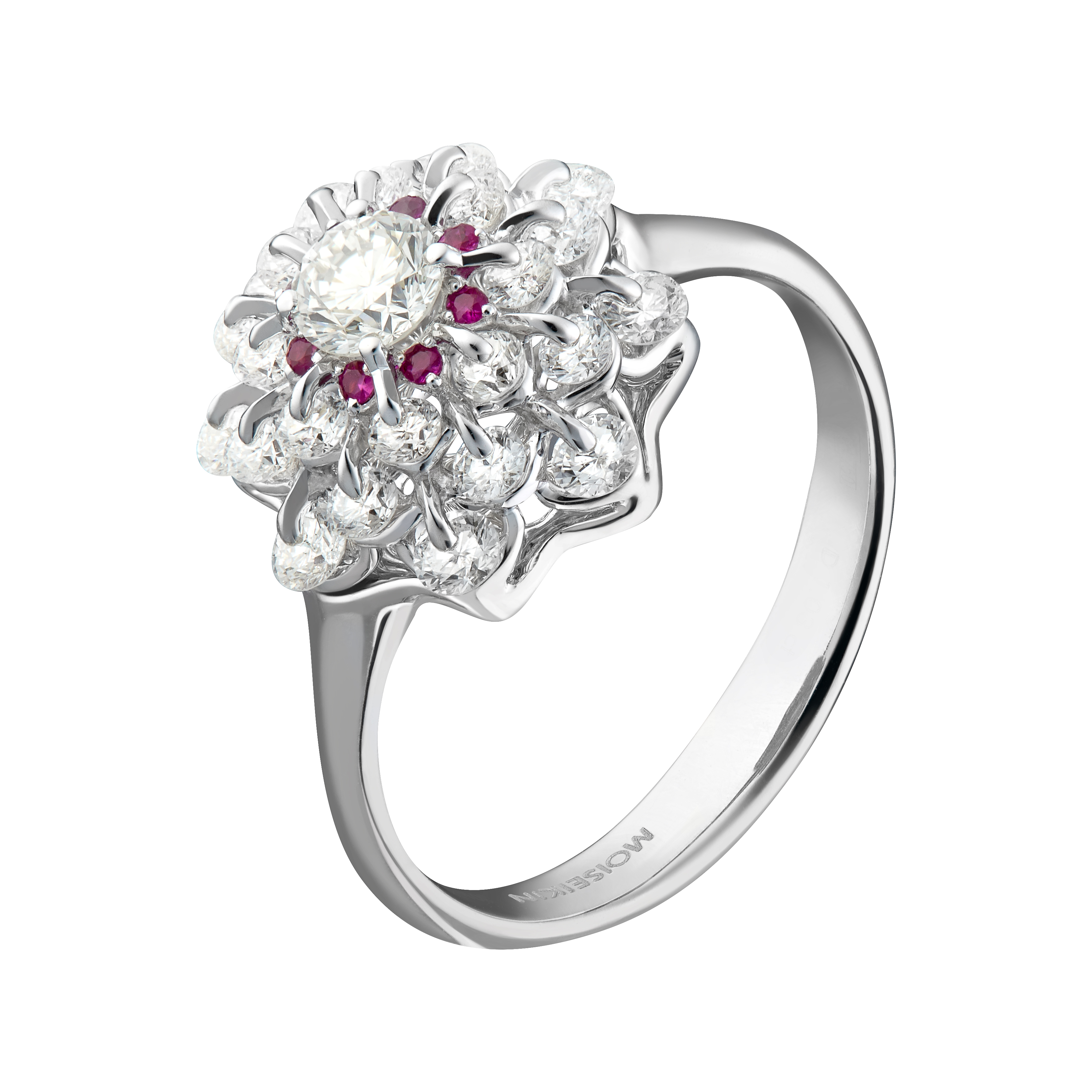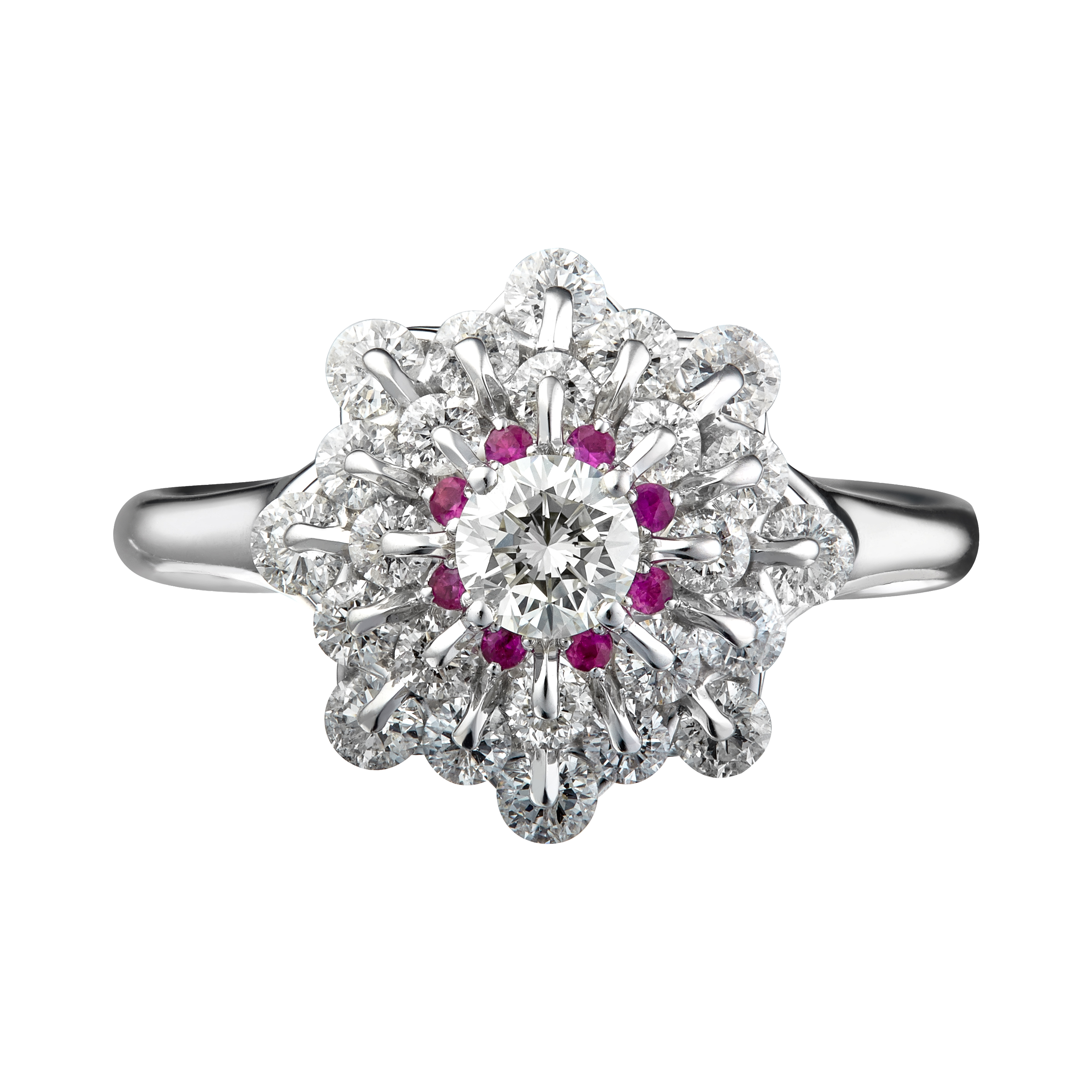 Diamond Ring mounted in the patented Russian technology (Waltzing Brilliance®) gives unusual shine since side stones tremble and rotate while maximizing shinning effect. Small diamond cut rubies give an accent for feminine and pure look. It suits for dairy wear or engagement ring. Currently, we are making with G/VS + diamond quality, but we do make with F/VVS or SI depending on request. Please contact if you have any question.