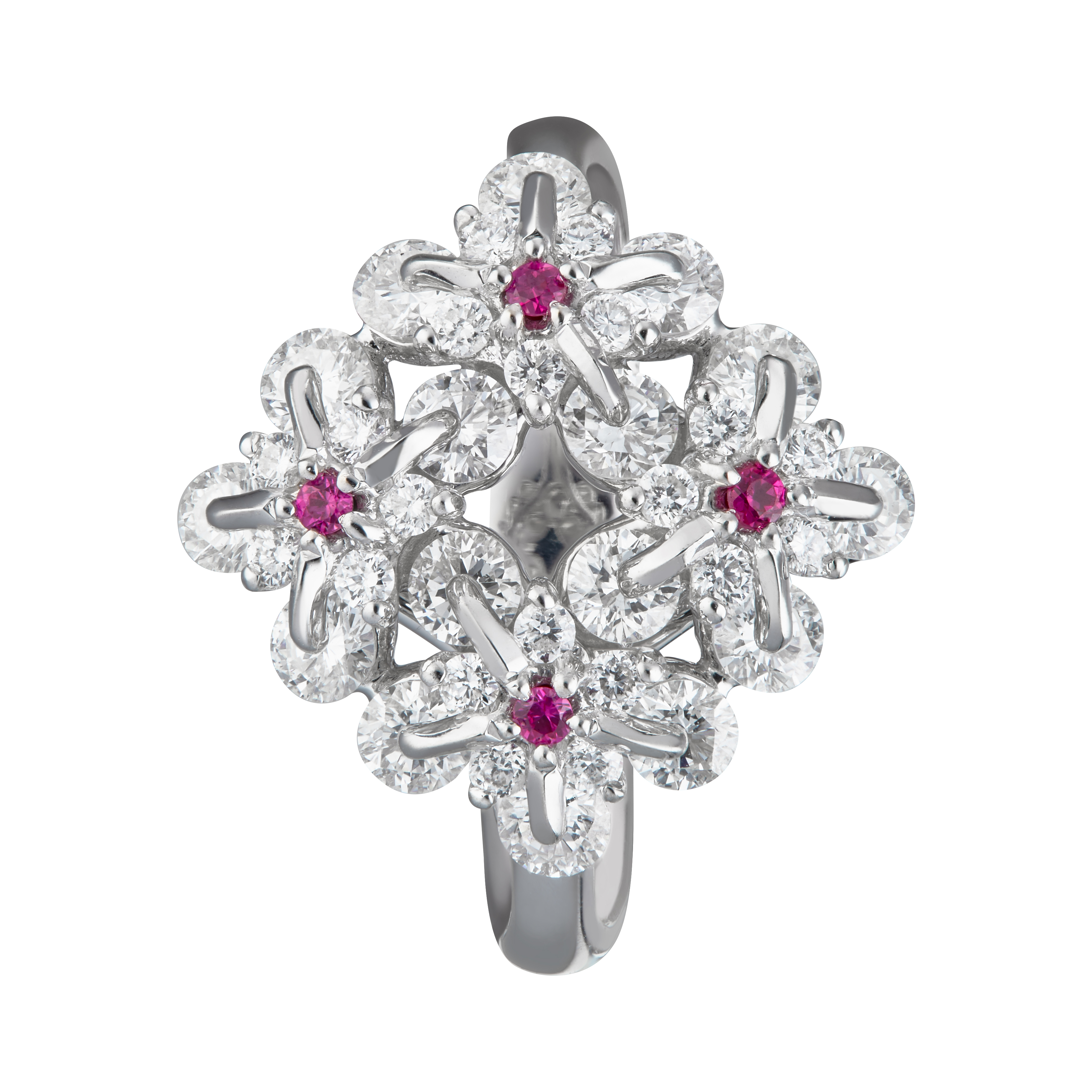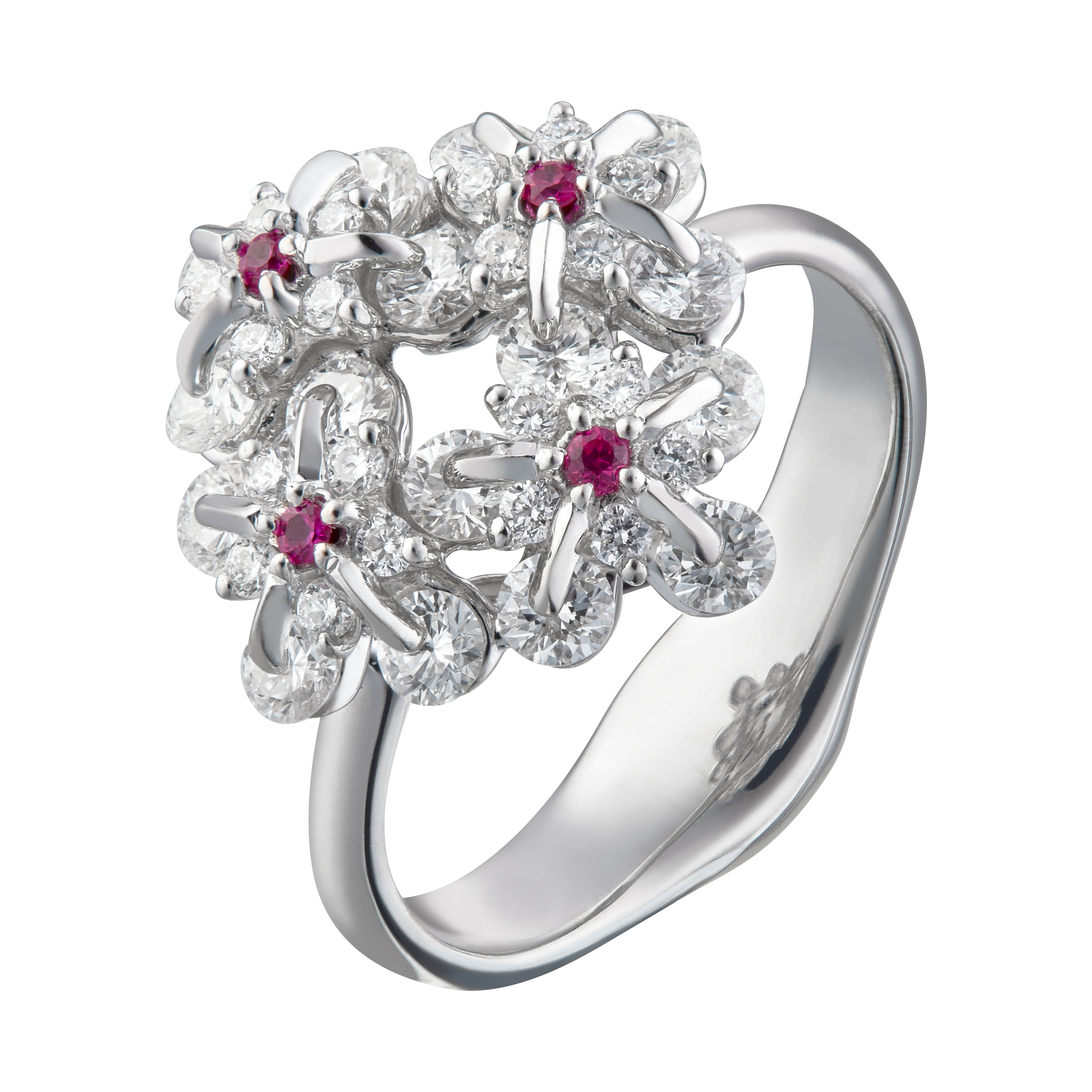 Symbol of remembrance and eternal love, Forget Me Not flower has become an everlasting flower made in 18karat white gold, 1.1ct diamonds with accent of rubies. Mounted in Waltzing Brilliance technology, this lively ring will be a precious memory of beautiful moment. Internationally patented in the US, China, Europe, Waltzing Brilliance technology is an innovative jewellery invention patented by Viktor Moiseikin, in which a diamond facet gem secured by two points turns and tremble while releasing the maximum light.