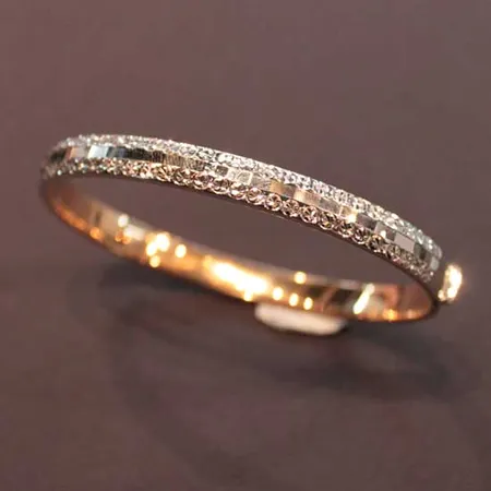 The alluring 18K white gold bangle is encrusted with two rows of precious stones at the sides, placing a rose gold band in between. The subtle design of this bangle appeals to those who look for classic beauty.