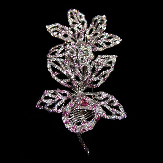 This 18K white gold brooch enchants you with a truly mesmerizing leaf design. The elaborate brooch features a matching synthesis of dazzling sapphires and diamonds. This piece will sure become a center of attention of your overall combinations.