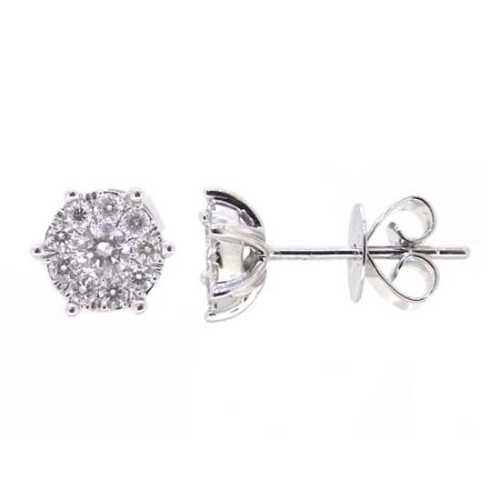 Pictured is a pair of earrings with 9 smaller diamonds surrounding a centered 0.10ct full cut diamond on each side. The design suggests modern elegance in a low-profile style. The earrings complete your evening look with an unspoken charm.