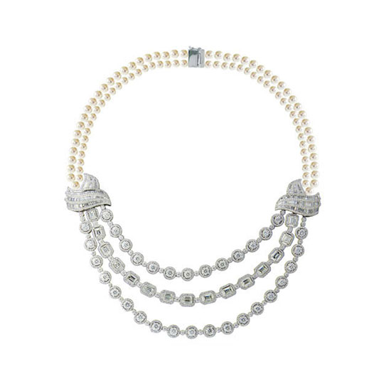 This fashionable necklace comes with a 3-row design for a decorative look. It is crafted with fancy diamonds on the 18K white gold setting for added elegance. This 18K white gold diamond necklace is great for complementing your chic look.