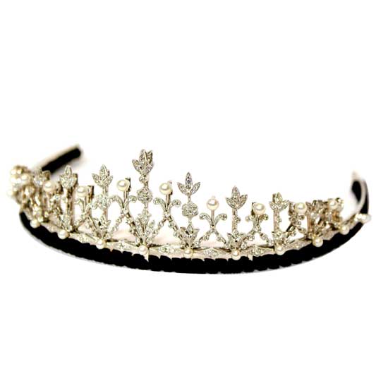 The admirable tiara crowns you the princess of the night with its extravagant design. The 18K white gold setting radiates a captivating glow that is simply irresistible. Flooded with elegance, this luxurious tiara is brought to the next level by the addition of Japanese fresh water pearls and 3.65 carats of twinkling diamonds. Express your class and taste completely with this princess tiara.
